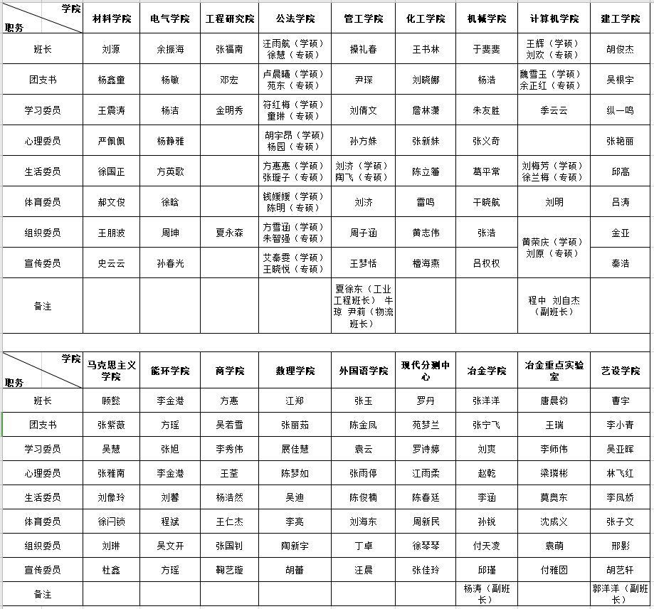 经个人申请,各培养单位考察认定,现将各培养单位2020级班级班干部名单公告如下: