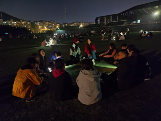 夜色朦胧的东校区操场荧光闪闪,给校园增添了许多活力。艺术与设计学院研究生们成群结伴活跃于绿茵场,纸牌游戏、闲物置换、成语接龙、剧本杀等,用欢声笑语打发着闲暇的时光。