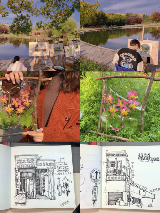 同学们及时调整自我,充分发挥艺术与设计精神,结合自身专业,将专业与生活融入。走入校园之中,在校园中寻找最美的画面,取校园中掉落的树枝和花瓣,利用绘画、手工、手绘等技法记录下美好景象,呈现出不同视角的校园。通过自我陶冶情操,泰然自若面对疫情期间封校管理带来的烦闷和不安。