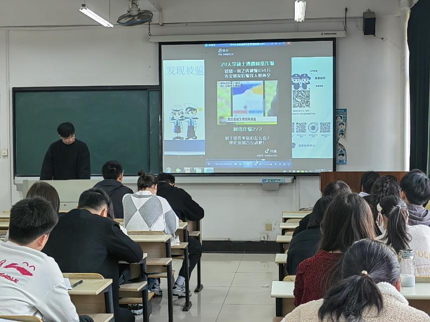 最后,2020级陶新宇同学向大家分享了关于预防网络诈骗的相关案例以及反诈秘诀,引导大家重视加强网络防范意识,保护自己的财产安全。