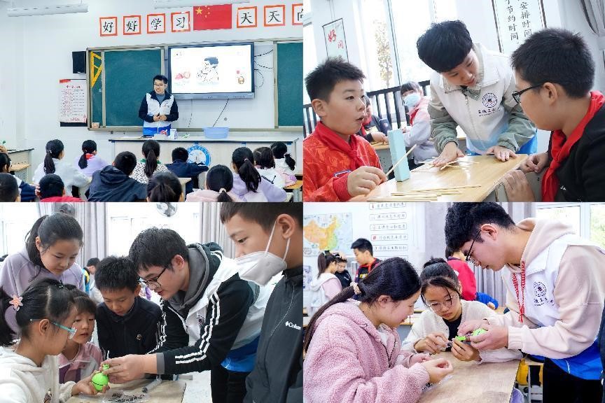 志愿活动前,学院做了精心的准备。志愿者队伍分小组选定科普主题,邀请学院物理实验中心主任孙文斌等老师从科普小实验的内在原理和现场展示进行指导,经过了解机理、模拟展示、反馈调整等各环节打磨,制作出科学、生动、有趣的课堂内容。9日上午,三个科普小组进入到秀山第一小学,为六年级三个班的同学带去了《拱形结构—倍力桥》《神奇的表面张力及大气压》《数字黑洞》等多个有趣的科普小实验,通过PPT讲解、视频观看、实验演示和动手体验等环节让同学们更直观的体会到生活中与物理、数学有关的有趣现象。