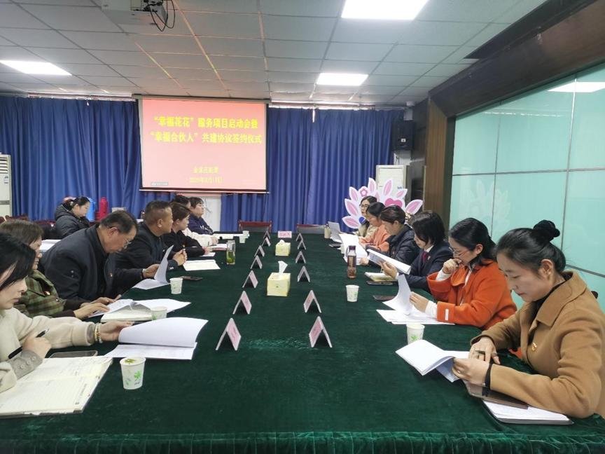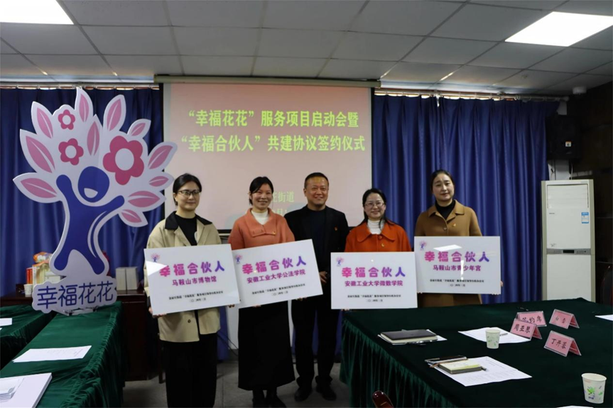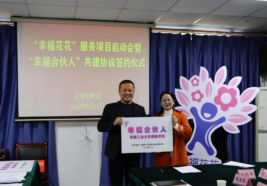 3月11日,花山区金家庄街道举行“幸福花花”服务项目启动仪式,共青团花山区委、微数学院、花山区妇联、花山区人民检察院等首批“幸福合伙人”单位代表参与了启动仪式,就共建工作进行了深入交流,并现场签署共建协议。签约仪式上,学院研究生党支部书记宋二银老师就共建工作进行了深入交流。