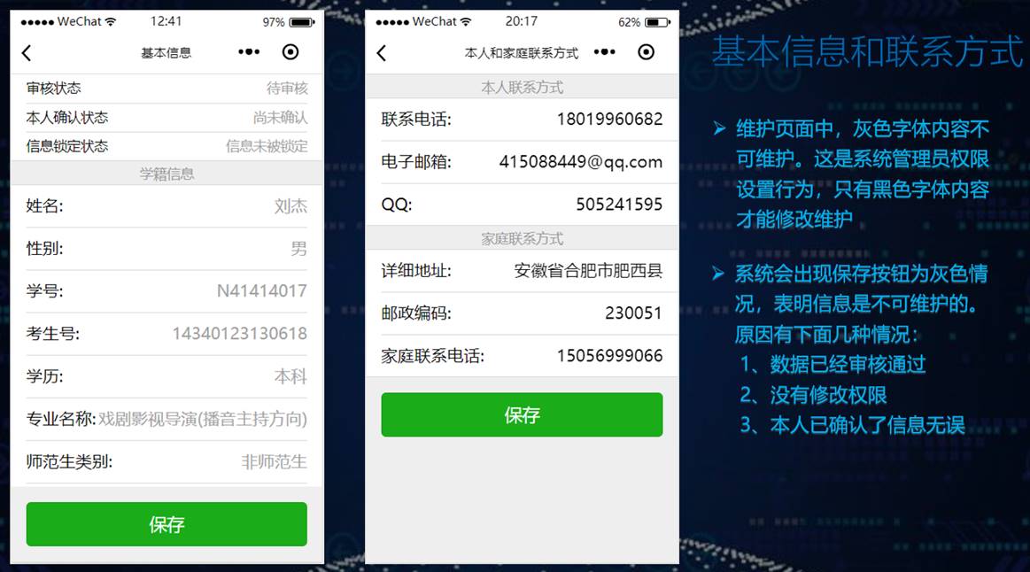 第一、二步:基本信息、本人及家庭联系方式核对。灰色部分出错请联系张老师,黑色部分可自行修改,确认无误点击保存。