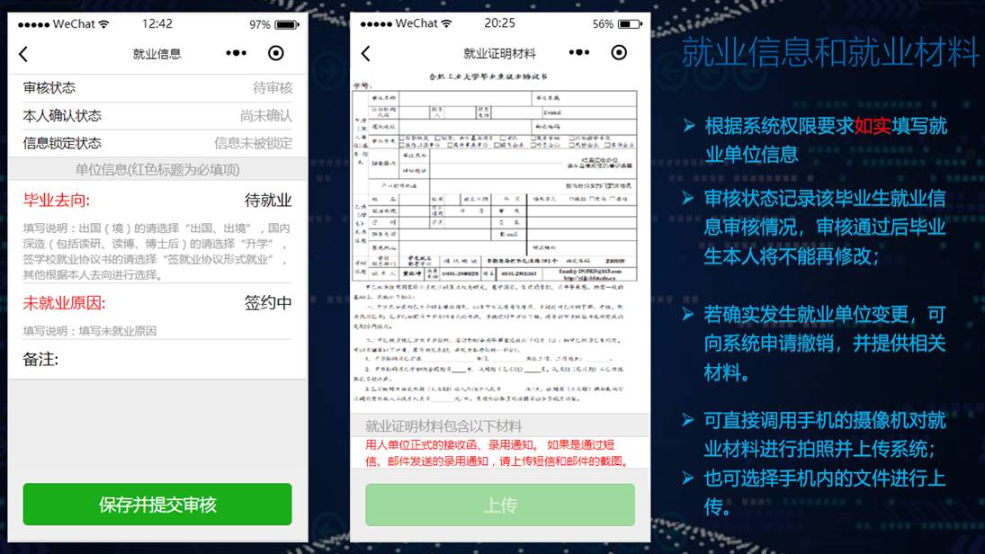 1.签订三方协议的同学选择签就业协议,签劳动合同的同学选择签订劳动合同就业,证明函、录用通知等选择其他方式就业,信息维护完成后拍照上传相应的证明材料。