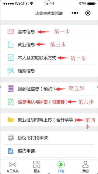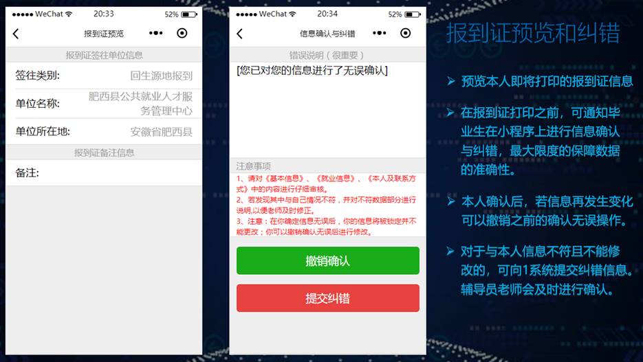 所有毕业生必须在小程序进行以上操作,确认信息无误,否则无法打印报到证!!